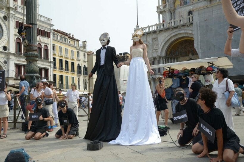 In Piazza San Marco, Extinction Rebellion ha reso visibile il dominio dei mega miliardari sui governi e sulle istituzioni internazionali. Tra denuncia e performance, le proteste contro il matrimonio di Bezos sono riuscite a riportare al centro del dibattito la tossicità dei colossi tech.