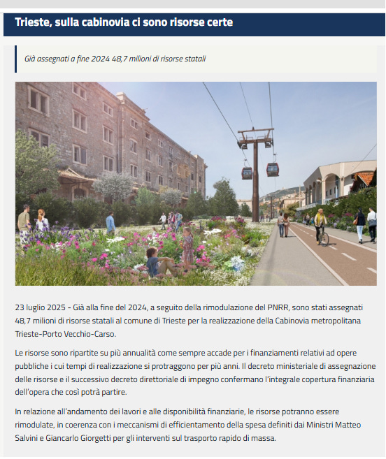 A questo punto, il ministro Matteo Salvini alla fiera dell’est ha fatto ciò che si fa quando un’operazione politica è in difficoltà: ha chiesto al suo stesso ministero di scrivere al Ministero dell’Economia e delle Finanze per cercare soldi che non esistono. Questo è il punto politico centrale: l’ovovia non ha e non ha mai avuto copertura finanziaria.